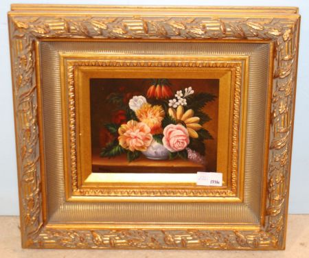 Oil painting on canvas of flowers signed Steinzy in left corner; 20 1/2" w., 19" h. Oil painting on canvas of flowers signed Steinzy in left corner; 20 1/2" w., 19" h.