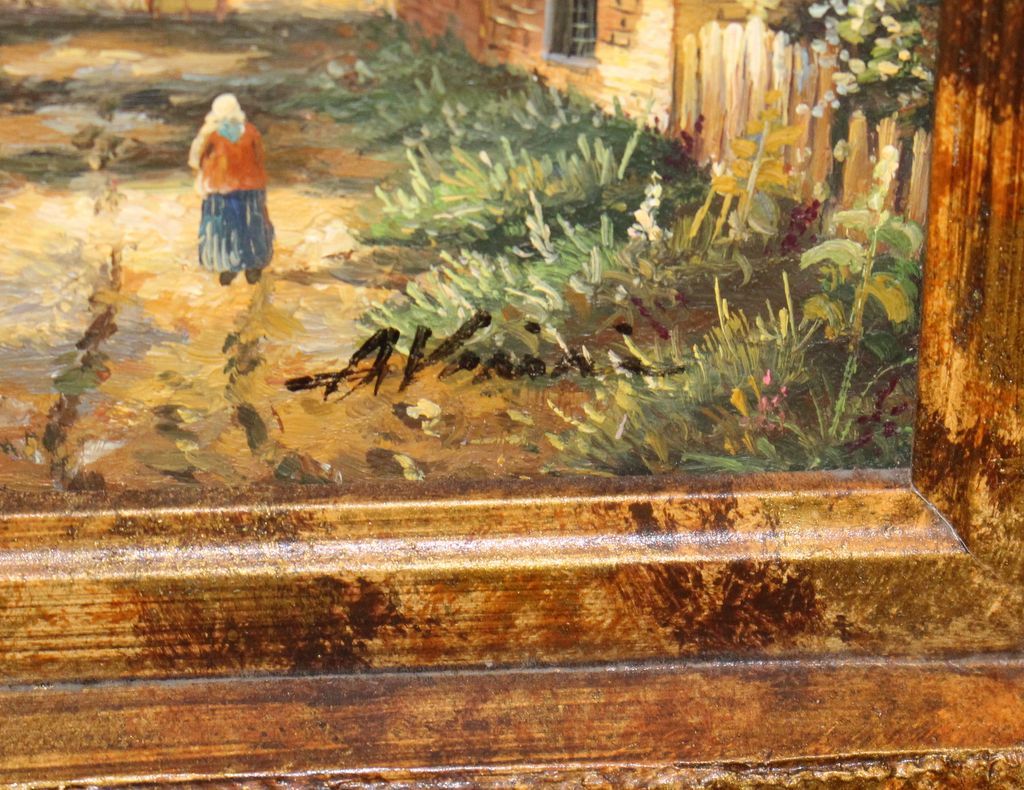 Oil painting on canvas of village with houses, river, and windmill; signed lower right; 18" w., 16 1/2" h. Oil painting on canvas of village with houses, river, and windmill; signed lower right; 18" w., 16 1/2" h.