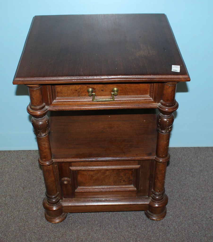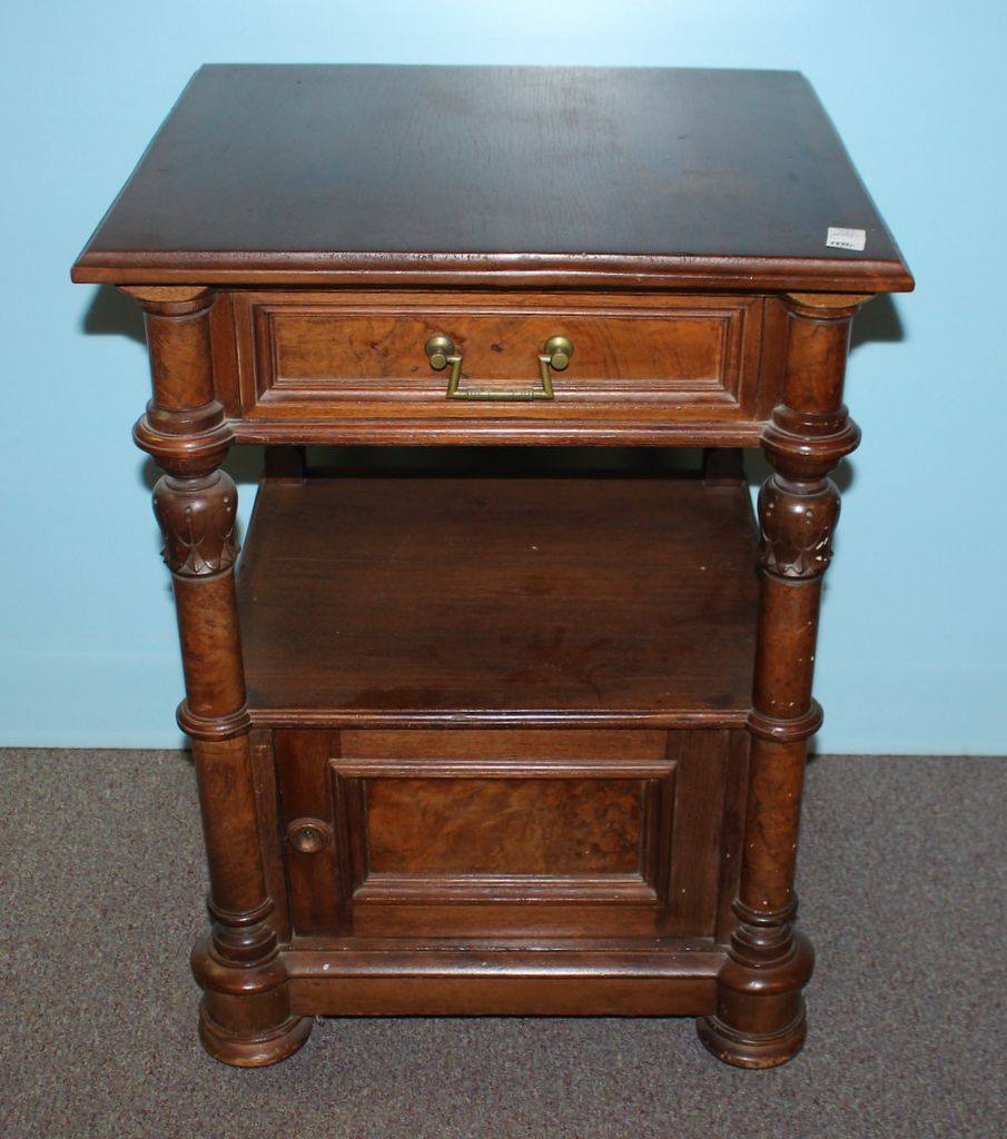 Nineteenth century walnut Renaissance bedside table with shelf, one drawer and cookie corner columns ; 22" w., 20" dia., 31" h. Nineteenth century walnut Renaissance bedside table with shelf, one drawer and cookie corner columns ; 22" w., 20" dia., 31" h.