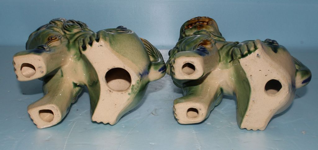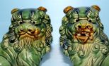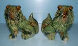 Pair Chinese ceramic foo dogs with green glaze; 7" w., 8 1/2" h. Pair Chinese ceramic foo dogs with green glaze; 7" w., 8 1/2" h.