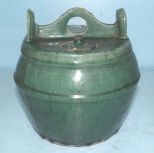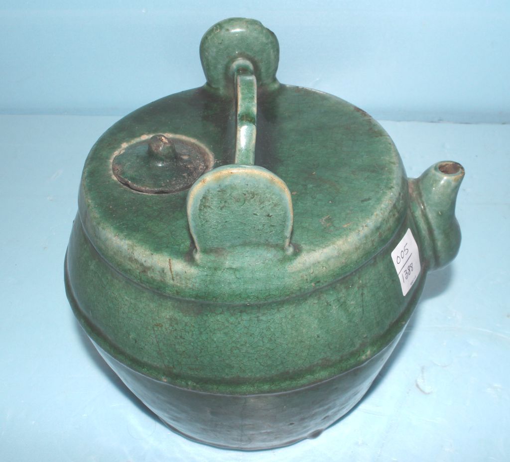 Antique Chinese teapot with green glaze; 6 1/2" dia., 8" h. Antique Chinese teapot with green glaze; 6 1/2" dia., 8" h.