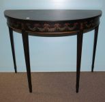 Contemporary demi lune console with hand painted swags of fruit and flowers, supported by tapered string painted legs; 46" w., 23" dia., 34 1/2" h. Contemporary demi lune console with hand painted swags of fruit and flowers, supported by tapered string painted legs; 46" w., 23" dia., 34 1/2" h.