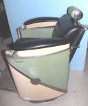 Vintage Koken barber chair. President model mid 20th century barrel style barber chair in green leather and chrome; 27" w., 28" d., 42" h. Vintage Koken barber chair. President model mid 20th century barrel style barber chair in green leather and chrome; 27" w., 28" d., 42" h.