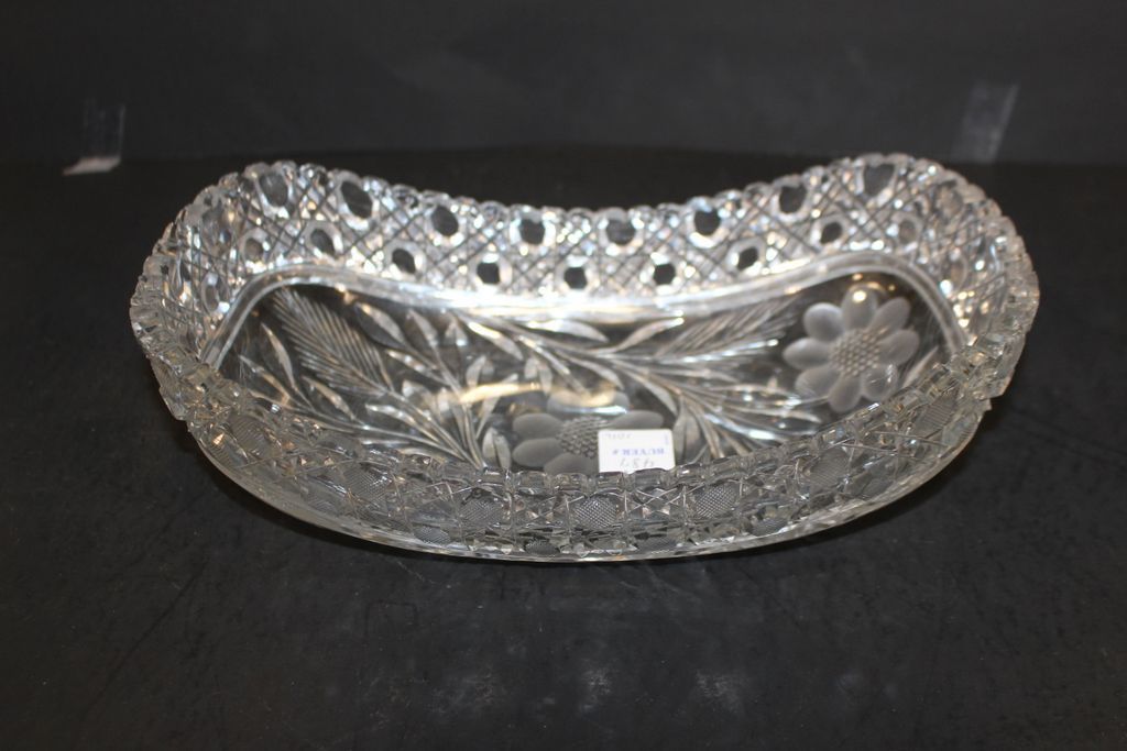 Brilliant cut glass rectangular bowl or banana boat with flowers; 11 1/4" wide Brilliant cut glass rectangular bowl or banana boat with flowers; 11 1/4" wide