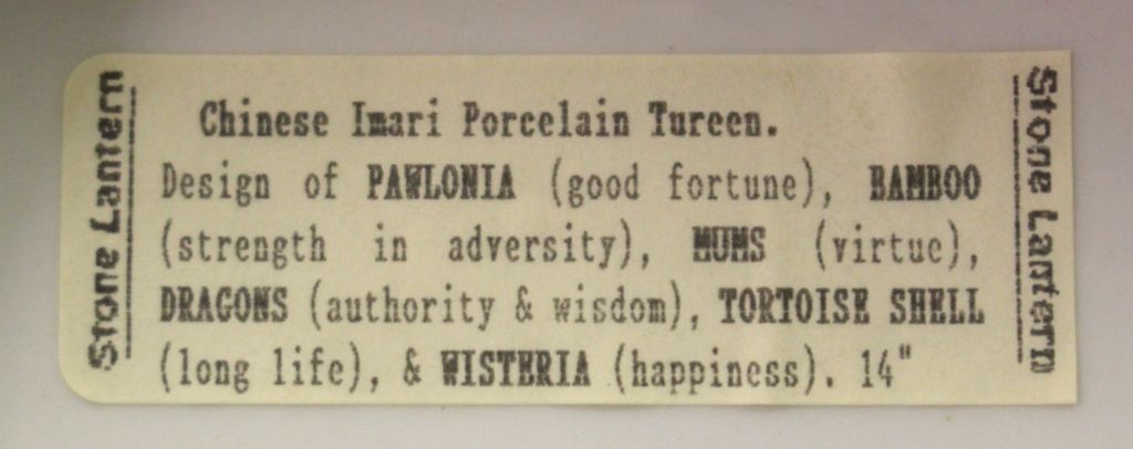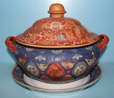 Chinese Imari porcelain tureen design of pawlonia (good fortune), bamboo (strength), mums (virtue), dragons (wisdom), tortoise shell (long life), and wisteria (happiness). Tureen has under plate. Underplate, 13" w.; tureen, 14" w., 10 1/2" h. Chinese Imari porcelain tureen design of pawlonia (good fortune), bamboo (strength), mums (virtue), dragons (wisdom), tortoise shell (long life), and wisteria (happiness). Tureen has under plate. Underplate, 13" w.; tureen, 14" w., 10 1/2" h.