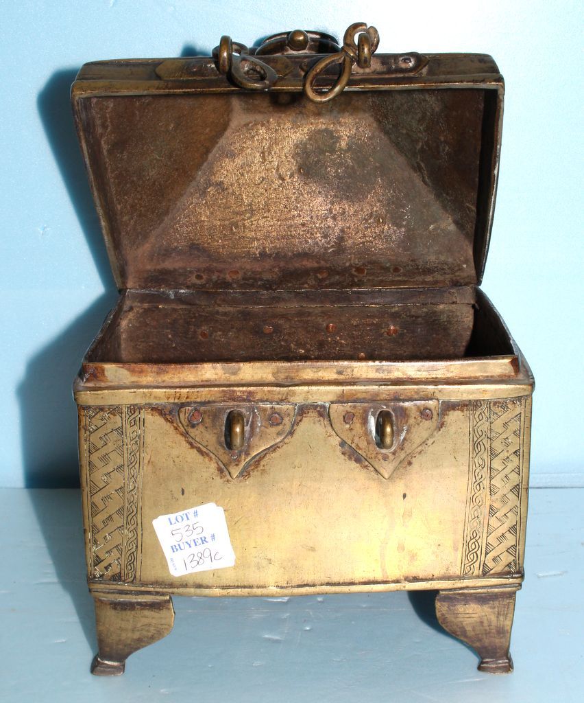 Vintage brass treasure chest box on bracket feet; 6 1/2" w., 5" d., 9" h. Vintage brass treasure chest box on bracket feet; 6 1/2" w., 5" d., 9" h.