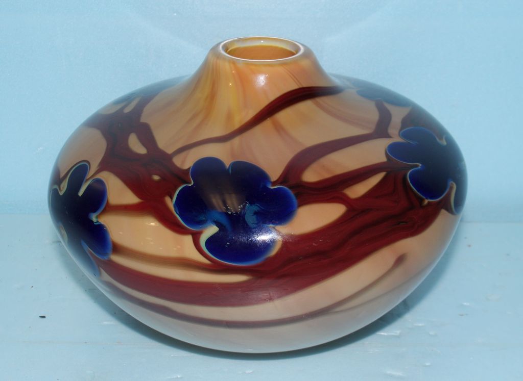 Stunning modernist bulbous shaped art glass vase signed JBY Ron 80 on the bottom; 7" dia., 6" h. Stunning modernist bulbous shaped art glass vase signed JBY Ron 80 on the bottom; 7" dia., 6" h.