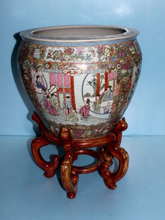 580 Large Chinese Rose Canton Jardiniere on Rosewood Stand