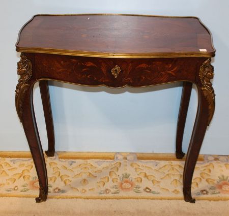 Louis XVI style side table with brass banding, decorative ladies heads on the corners, beautiful floral inlay on top and drawer; 32" w., 20 1/2" d., 30 1/2" h. Louis XVI style side table with brass banding, decorative ladies heads on the corners, beautiful floral inlay on top and drawer; 32" w., 20 1/2" d., 30 1/2" h.