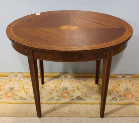 Oval hepplewhite style side table. Hepplewhite style side table with oval inlay in the center and inlay banding on sides and legs; 32" w.,22" d., 24" h. Oval hepplewhite style side table. Hepplewhite style side table with oval inlay in the center and inlay banding on sides and legs; 32" w.,22" d., 24" h.