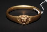 Victorian bangle bracelet. Hinged lions head bangle bracelet with three stones (one missing) marked W.M.C. Victorian bangle bracelet. Hinged lions head bangle bracelet with three stones (one missing) marked W.M.C.