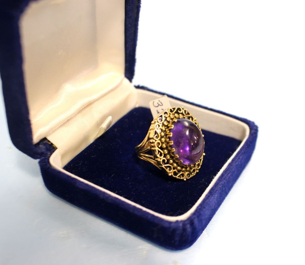 A ladies ring with an oval cabachon amethyst stone set in a 14 karat yellow gold mounting. Ring is size 11 A ladies ring with an oval cabachon amethyst stone set in a 14 karat yellow gold mounting. Ring is size 11