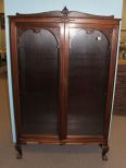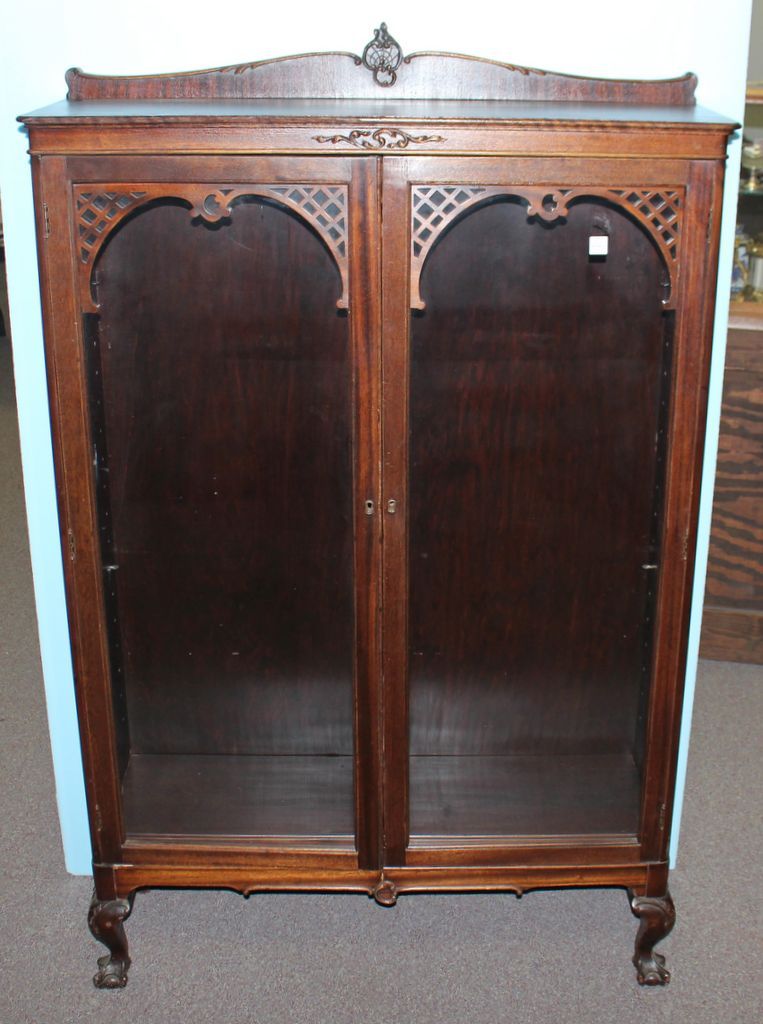 Early twentieth century bookcase or secretary having two glass doors with lattice work, carved crest. Interior has two shelves, base with ball and claw feet; 39 1/2" w., 13" d., 63" h. Early twentieth century bookcase or secretary having two glass doors with lattice work, carved crest. Interior has two shelves, base with ball and claw feet; 39 1/2" w., 13" d., 63" h.