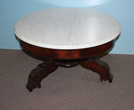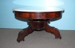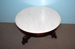 Empire period mahogany marble top table which has been reduced in size in order to be used as a coffee table; 32" dia., 20" h. Empire period mahogany marble top table which has been reduced in size in order to be used as a coffee table; 32" dia., 20" h.