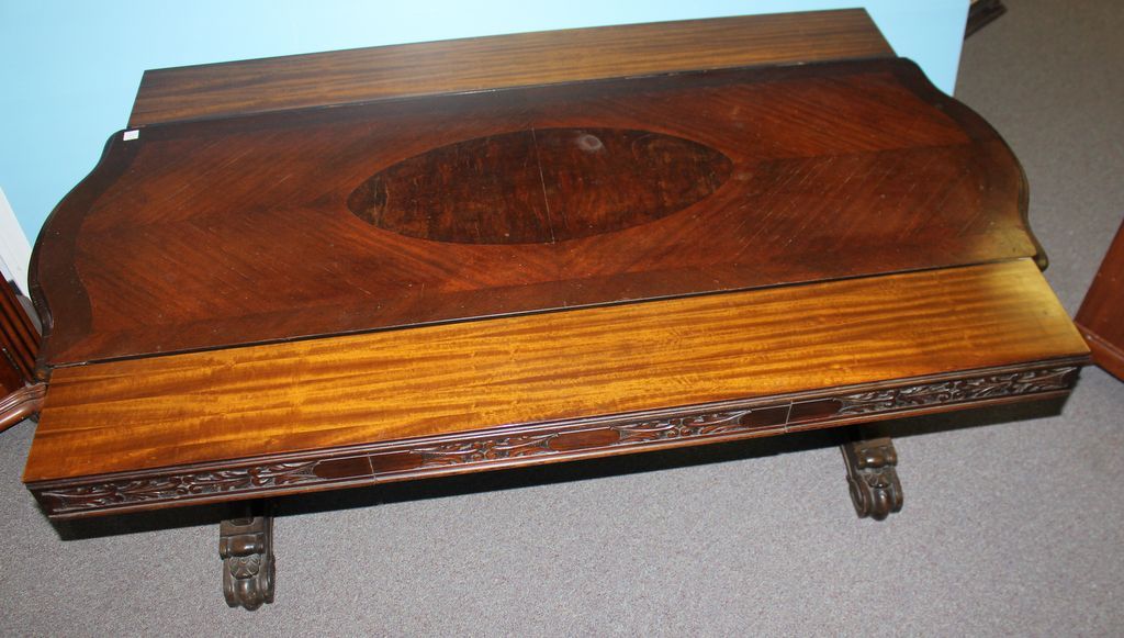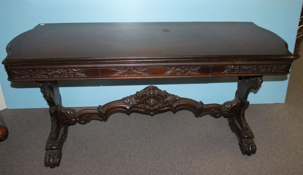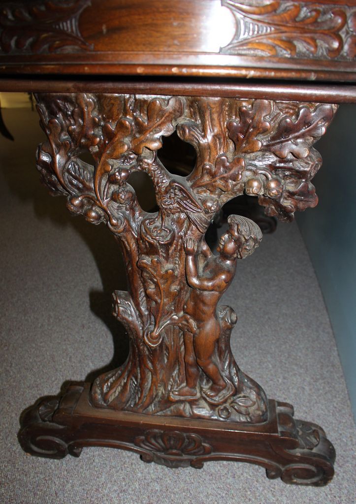 Unusual 1920's library/ dining table. Elaborately carved library table with center divided drawer and two slide out leaves. This table has three woods including walnut, burl walnut and mahogany. Beautiful carved skirt and top supported by carving of standing cupid by tree with bird connected by elaborately carved stretcher. Likely New York maker; 65 1/2" w., 24 1/4" d., 31" h. Unusual 1920's library/ dining table. Elaborately carved library table with center divided drawer and two slide out leaves. This table has three woods including walnut, burl walnut and mahogany. Beautiful carved skirt and top supported by carving of standing cupid by tree with bird connected by elaborately carved stretcher. Likely New York maker; 65 1/2" w., 24 1/4" d., 31" h.
