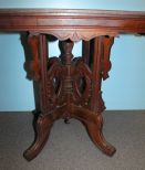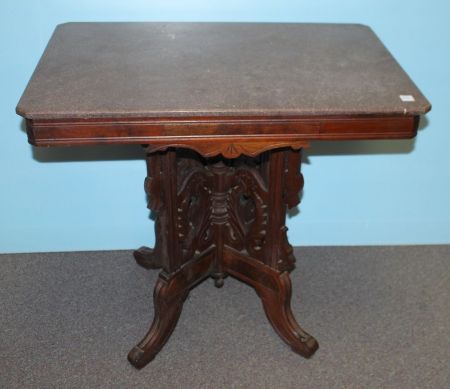 Walnut Victorian rectangular table with rouge marble top. Eastlake marble top table with walnut veneer panels on each side, carved ornate legs; 32" w., 22" d., 28" h. Walnut Victorian rectangular table with rouge marble top. Eastlake marble top table with walnut veneer panels on each side, carved ornate legs; 32" w., 22" d., 28" h.