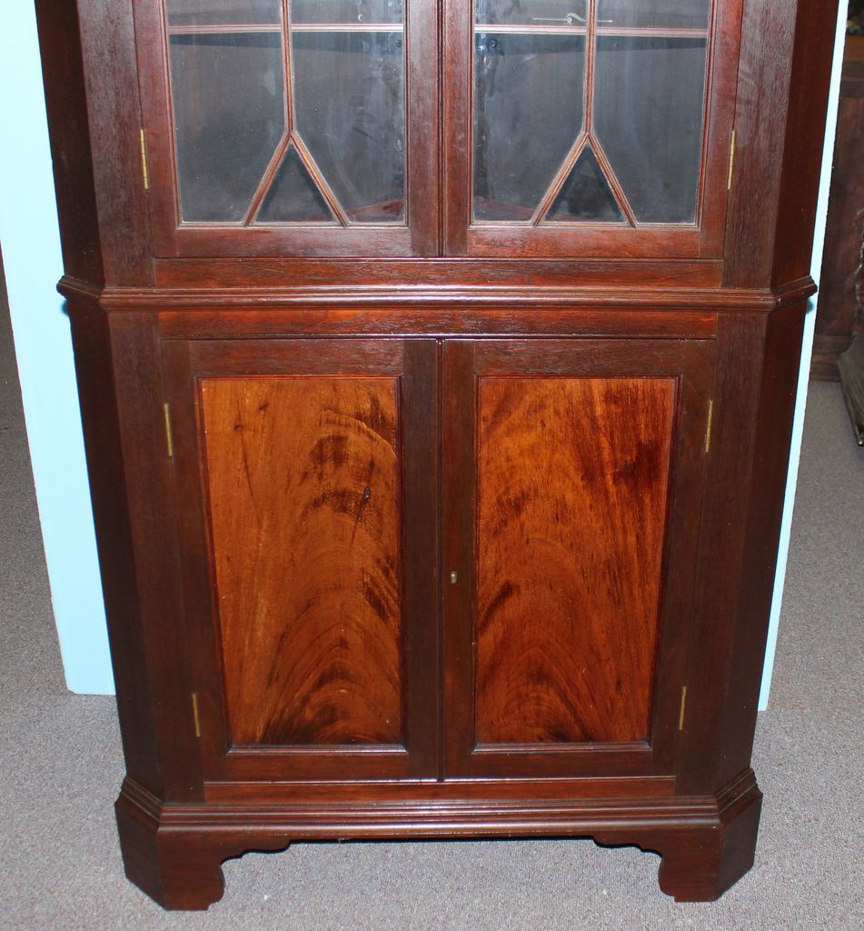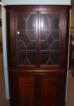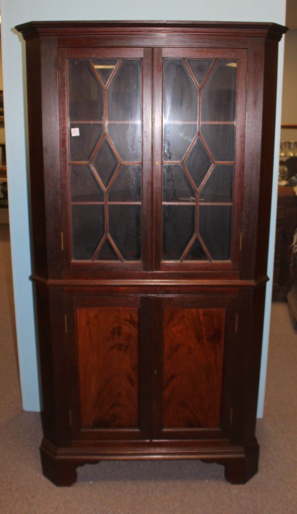 Mid twentieth century mahogany corner cabinet with two glass doors that have fancy latticework. Cabinet is supported by bracket feet; 35" w., 23" d., 69" h. Mid twentieth century mahogany corner cabinet with two glass doors that have fancy latticework. Cabinet is supported by bracket feet; 35" w., 23" d., 69" h.