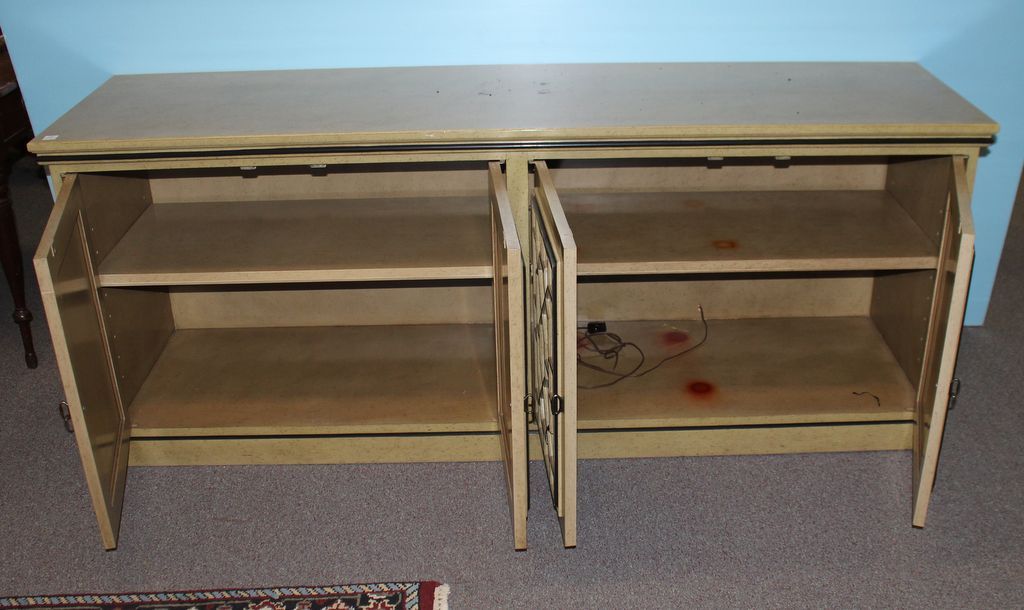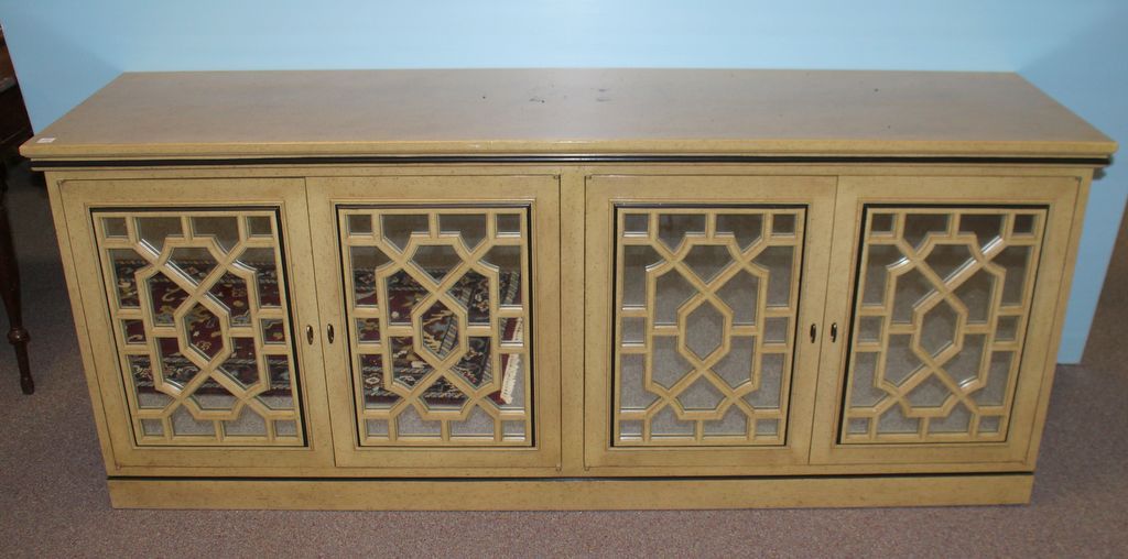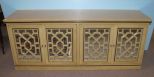 Contemporary four door console having elaborate latticework on doors with mirrored backs; 71 1/2" w., 20" d., 30" h. Contemporary four door console having elaborate latticework on doors with mirrored backs; 71 1/2" w., 20" d., 30" h.