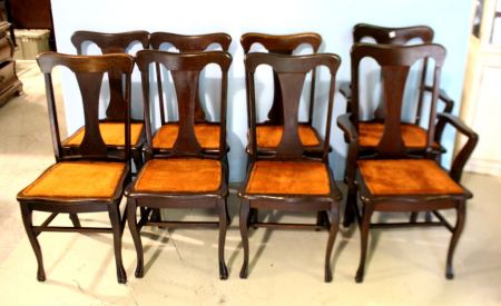 Set of eight nineteenth century dining chairs having six sides, one arm; Paper label on bottom of seat, Larkin Company, Buffalo, N.Y.; 18" w., 16" d., 37" h. Set of eight nineteenth century dining chairs having six sides, one arm; Paper label on bottom of seat, Larkin Company, Buffalo, N.Y.; 18" w., 16" d., 37" h.