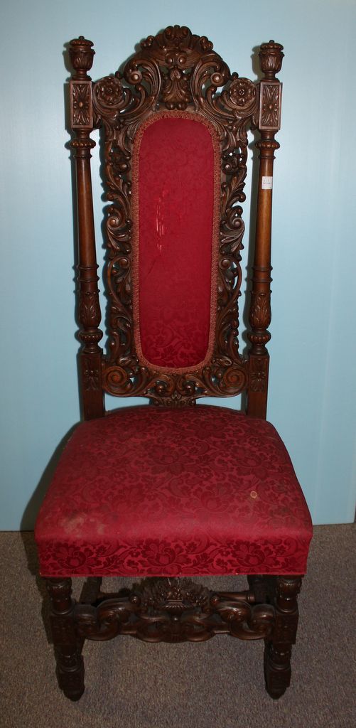 19th century heavily carved walnut hall chair. Jacobean style heavily foliage carving on crest; 16 1/2" w., 18" d., 50 1/2" h. 19th century heavily carved walnut hall chair. Jacobean style heavily foliage carving on crest; 16 1/2" w., 18" d., 50 1/2" h.