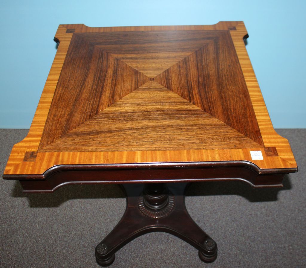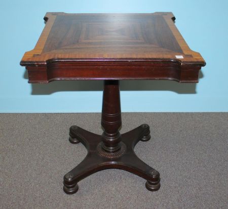 19th century regency style card table with beautiful light wood cross banding; 25" sq., 28 1/2" h. 19th century regency style card table with beautiful light wood cross banding; 25" sq., 28 1/2" h.