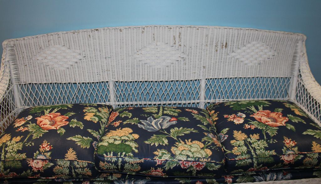 Victorian three cushion wicker sofa; 74" w., 26" d., 35" h. Victorian three cushion wicker sofa; 74" w., 26" d., 35" h.