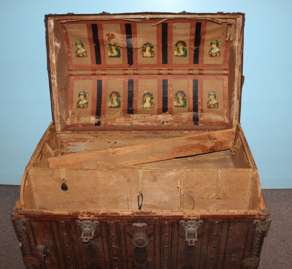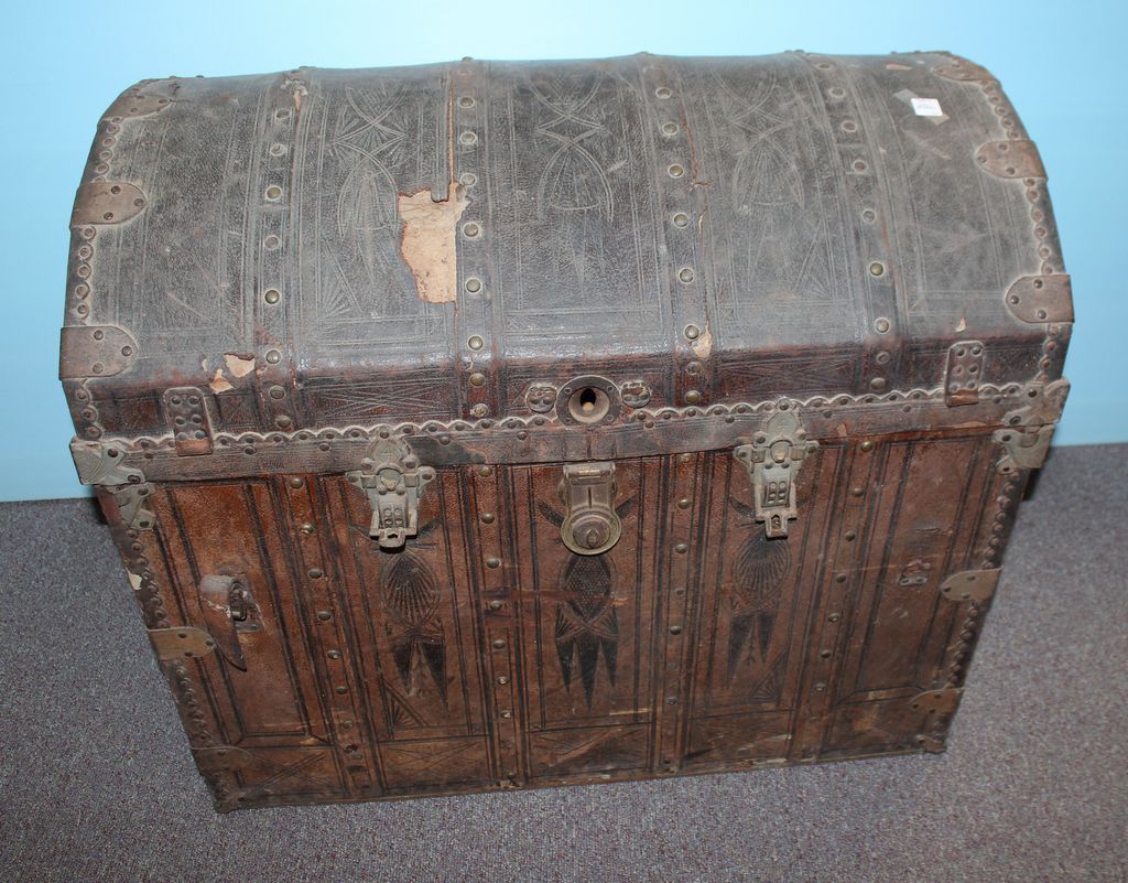 19th century large dome top steamer trunk. Trunk covered with wide ornate leather and has interior tray; 34" w., 24" d., 31" h. 19th century large dome top steamer trunk. Trunk covered with wide ornate leather and has interior tray; 34" w., 24" d., 31" h.