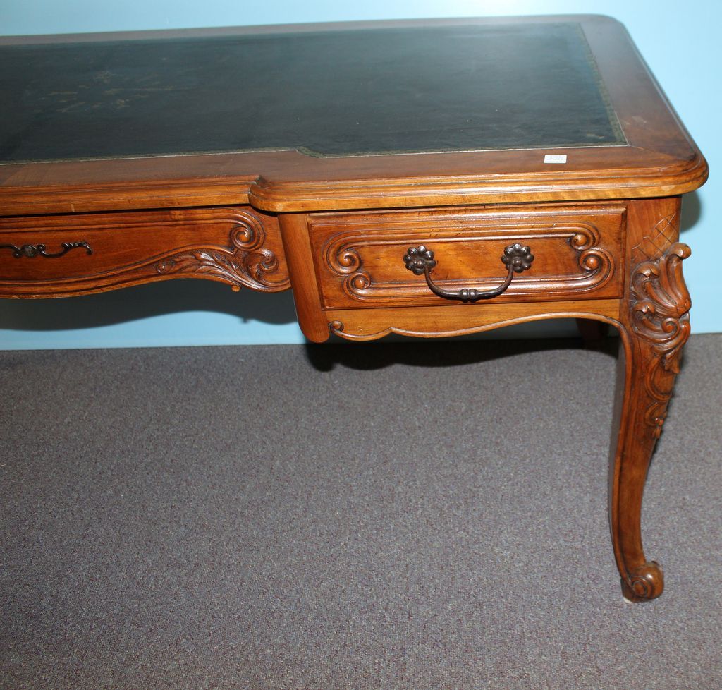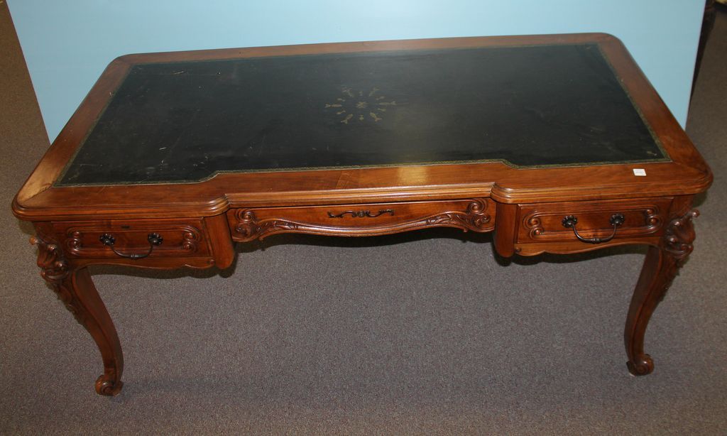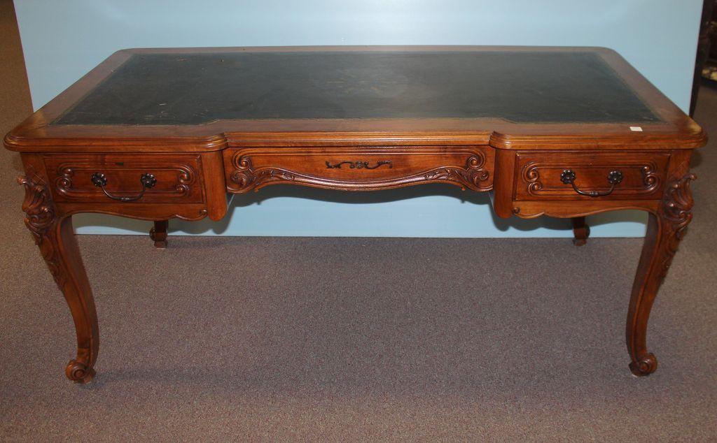 19th century mahogany French style partners desk which has cabriole legs with black leather top, center drawer, and two side drawers; 65" w., 32" d., 30" h. 19th century mahogany French style partners desk which has cabriole legs with black leather top, center drawer, and two side drawers; 65" w., 32" d., 30" h.
