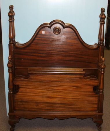 Pair mahogany queen ann style poster beds having scroll head boards supported by turned post; twin size; 55" h. Pair mahogany queen ann style poster beds having scroll head boards supported by turned post; twin size; 55" h.
