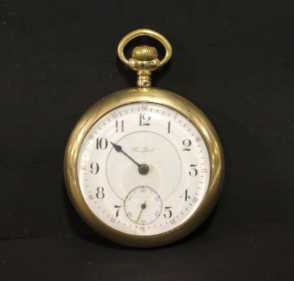 17 Jewel Rockford pocket watch. Glass front unscrews but can not open. (Missing on hand), etching on the back 17 Jewel Rockford pocket watch. Glass front unscrews but can not open. (Missing on hand), etching on the back