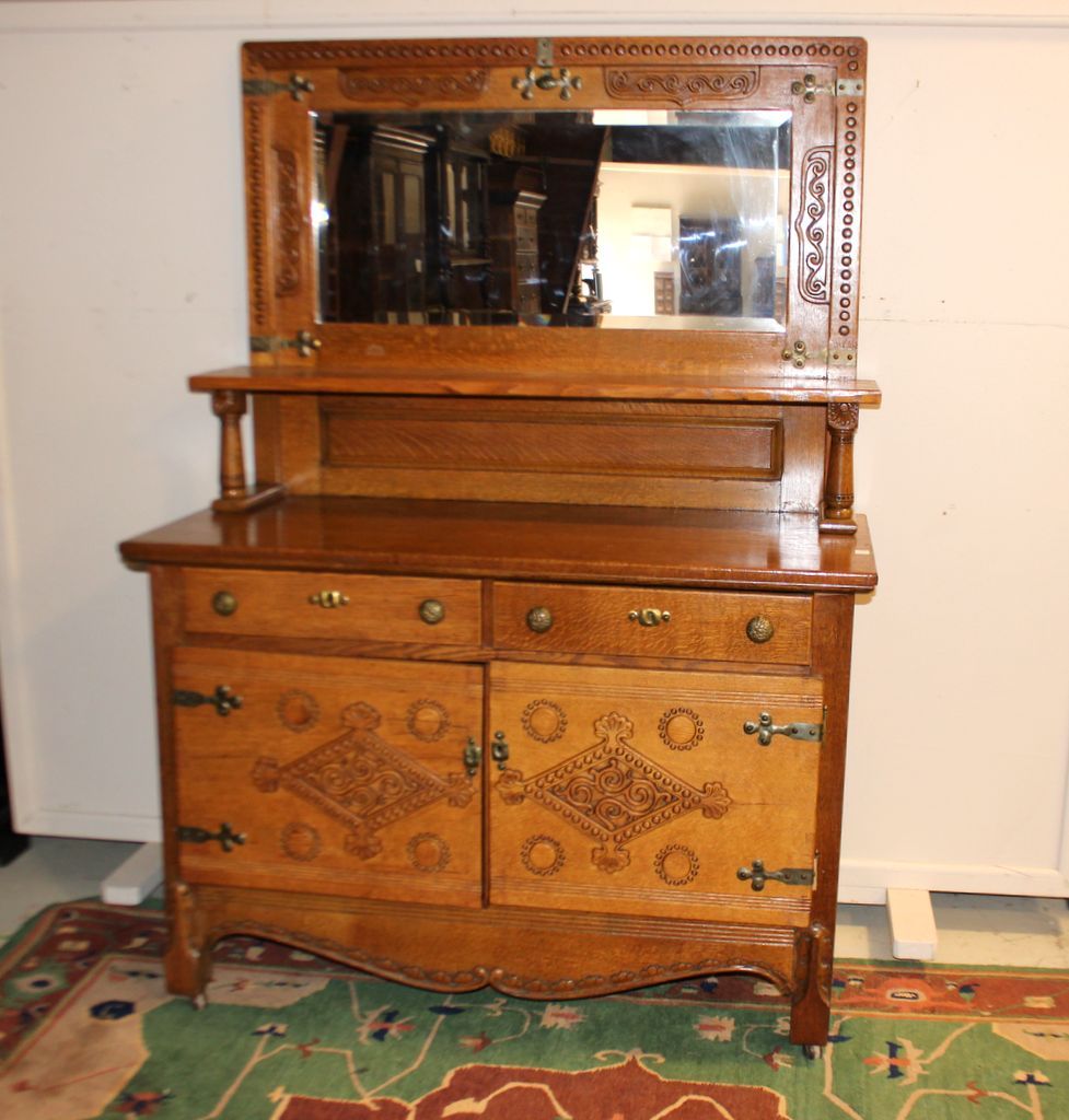 19th century oak sideboard. Two section sideboard. The top has a shelf with beveled glass mirror, carving and decorative metal ornamentation. The base has two drawers over doors which have unusual carving, carved apron; 53 1/2" w., 24" d., 75" h. 19th century oak sideboard. Two section sideboard. The top has a shelf with beveled glass mirror, carving and decorative metal ornamentation. The base has two drawers over doors which have unusual carving, carved apron; 53 1/2" w., 24" d., 75" h.