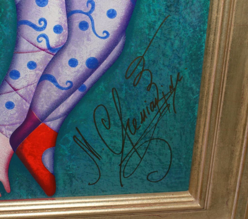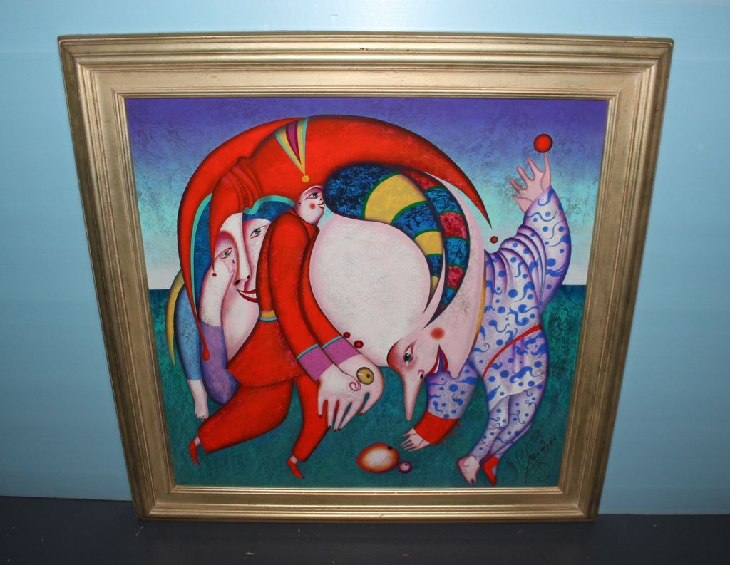 Circa 1998 Oil on Canvas Titled "Dancing with Fruits" signed Mihail Chemiakin (Russian artist born in 1943, Moscow). Painting in gold frame; 45" w., 45" h. Circa 1998 Oil on Canvas Titled "Dancing with Fruits" signed Mihail Chemiakin (Russian artist born in 1943, Moscow). Painting in gold frame; 45" w., 45" h.