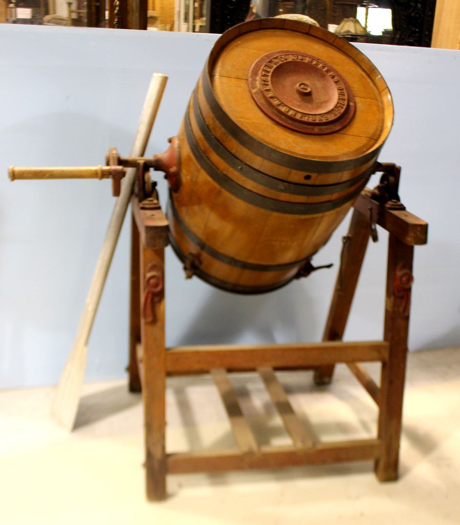Turn of the century, large, oak butter churn on stand with paddles. Size 4, 22 gallons. Capacity 1-11 gallons, butter produced 2-33 lbs. Turn of the century, large, oak butter churn on stand with paddles. Size 4, 22 gallons. Capacity 1-11 gallons, butter produced 2-33 lbs.