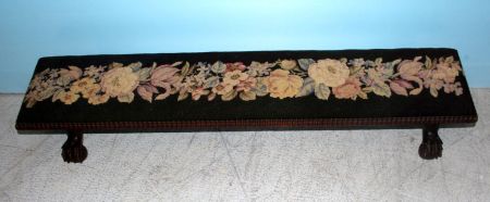 Early twentieth century mahogany kneeling bench covered in needlepoint supported by ball and claw feet. 43" w., 9" d., 6" h. Early twentieth century mahogany kneeling bench covered in needlepoint supported by ball and claw feet. 43" w., 9" d., 6" h.