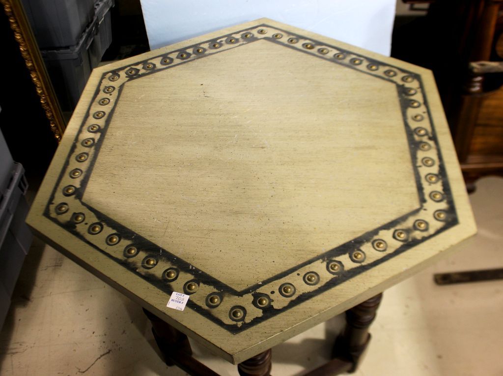 Hexagon shaped side table with brass tac accents. 28 1/2" w., 26 1/2" h. Hexagon shaped side table with brass tac accents. 28 1/2" w., 26 1/2" h.