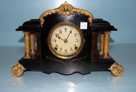 USA ebonized mantle clock with faux marble columns. 18" w., 12" h. USA ebonized mantle clock with faux marble columns. 18" w., 12" h.
