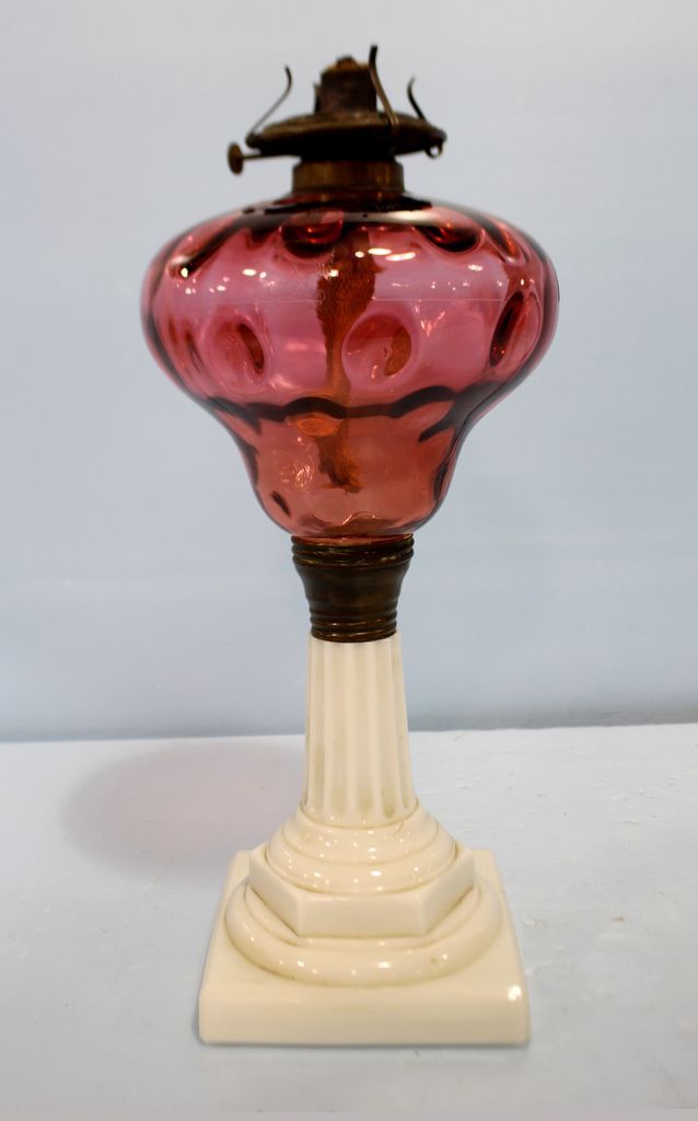 Milk glass Victorian oil lamp with cranberry coin dot font. 15" h. Milk glass Victorian oil lamp with cranberry coin dot font. 15" h.