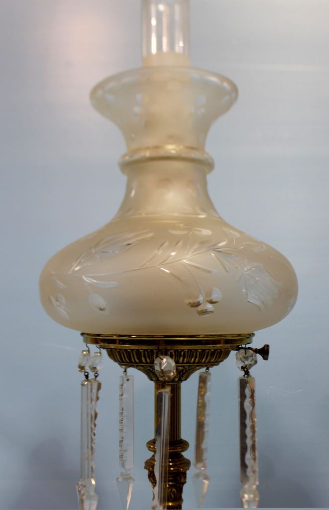 Pair brass and marble empire style astrol lamps with etched shades and prisms. 24" h. Pair brass and marble empire style astrol lamps with etched shades and prisms. 24" h.