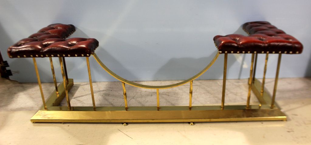 Brass and red leather fireplace seat; 59 1/2" length, 20 1/2" w., 18 1/2" h. Brass and red leather fireplace seat; 59 1/2" length, 20 1/2" w., 18 1/2" h.
