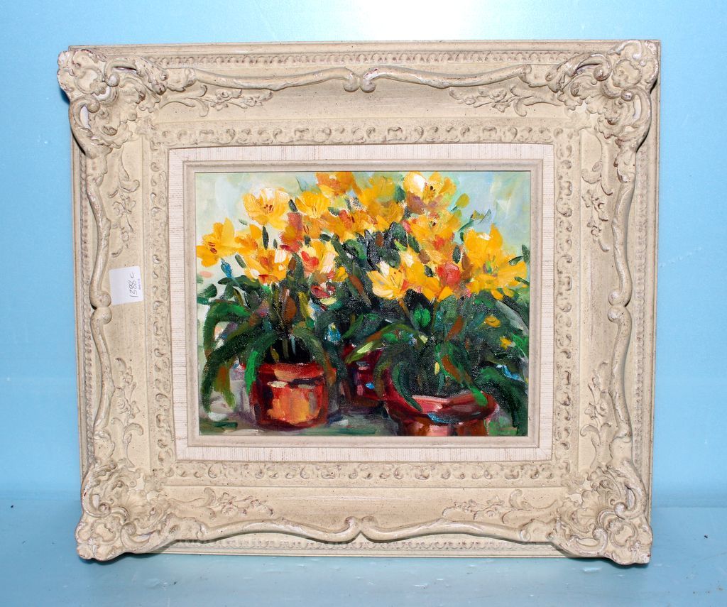 Painting of flowers in frame signed Yvette Sturgis. Yvette Sturgis was born in Panama and is a well known impressionist. She has shown at the Mississppi museum. 16 1/2", 14 5/8" Painting of flowers in frame signed Yvette Sturgis. Yvette Sturgis was born in Panama and is a well known impressionist. She has shown at the Mississppi museum. 16 1/2", 14 5/8"
