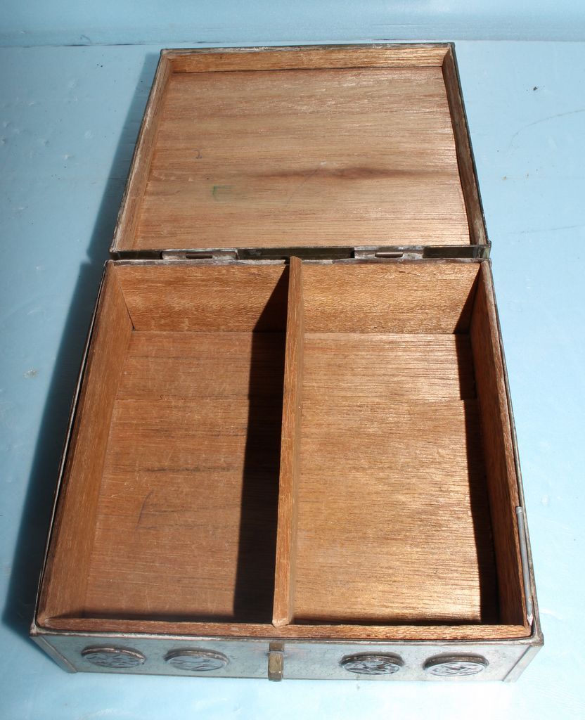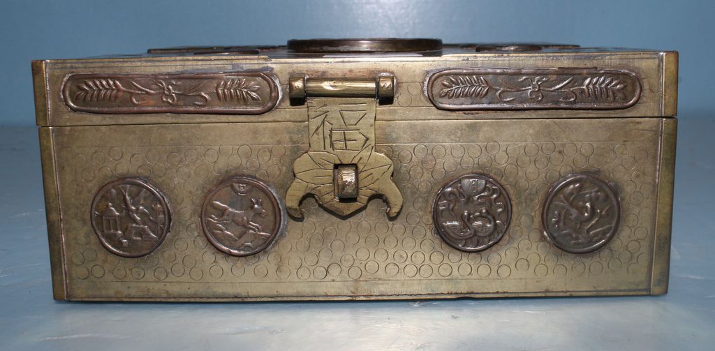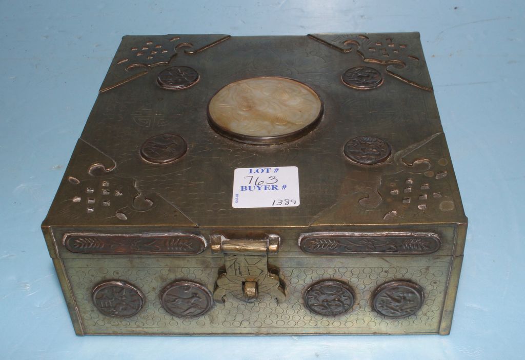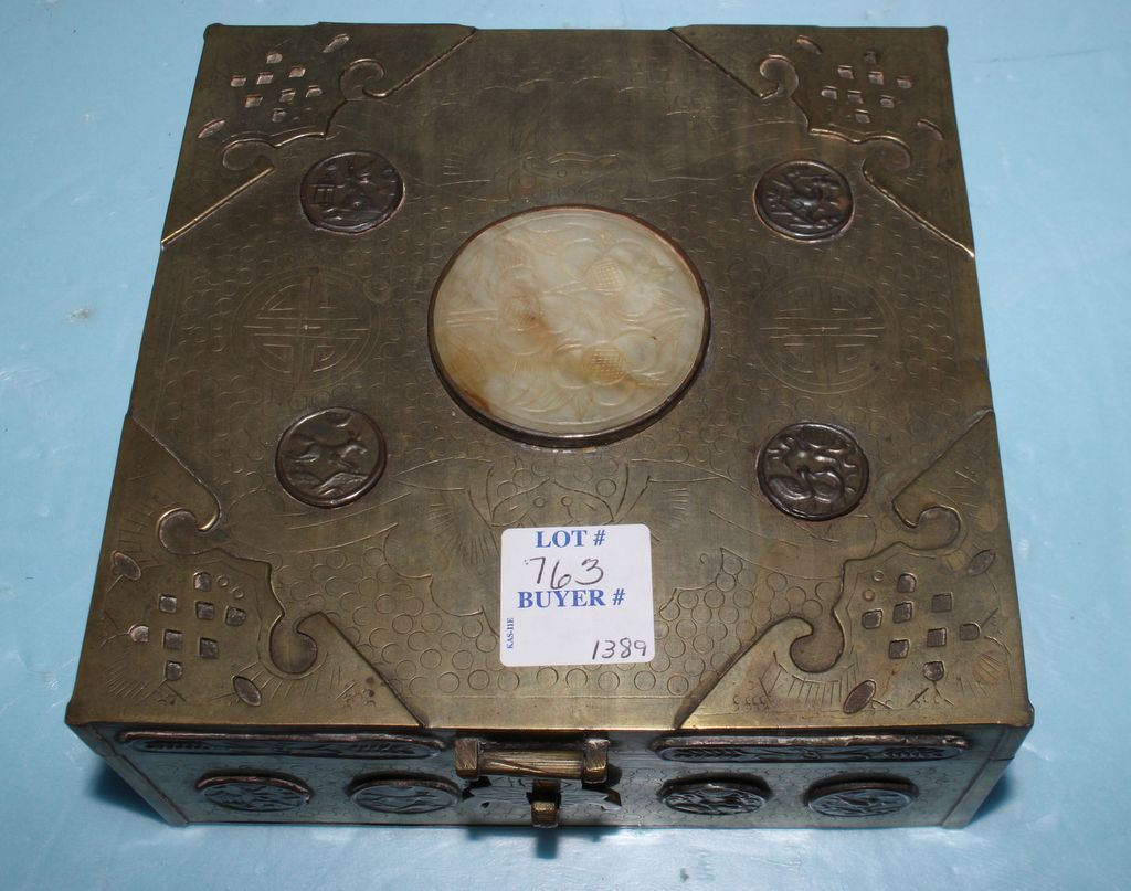 Ornate brass box in the oriental motif with stone insert (possibly jade); 6 1/4" w., 6" d., 2 1/2" h. Ornate brass box in the oriental motif with stone insert (possibly jade); 6 1/4" w., 6" d., 2 1/2" h.