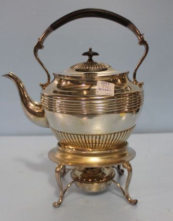 Victorian electroplated teapot on stand with ebony handle. Teapot marked HS LDS, EP; 11 1/2" h. Victorian electroplated teapot on stand with ebony handle. Teapot marked HS LDS, EP; 11 1/2" h.
