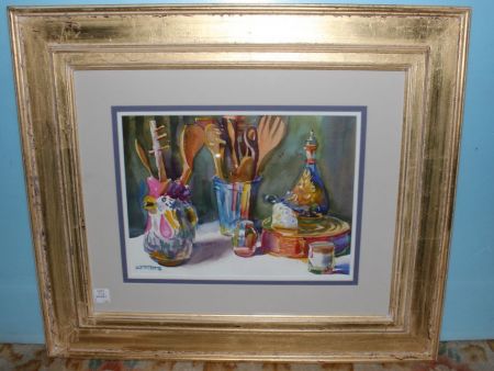 Original watercolor of wooden kitchen utensils and jars signed Waters (Wyatt Waters, Clinton, 1955); 27 1/2" w., 23 1/2" h. Original watercolor of wooden kitchen utensils and jars signed Waters (Wyatt Waters, Clinton, 1955); 27 1/2" w., 23 1/2" h.