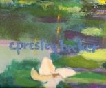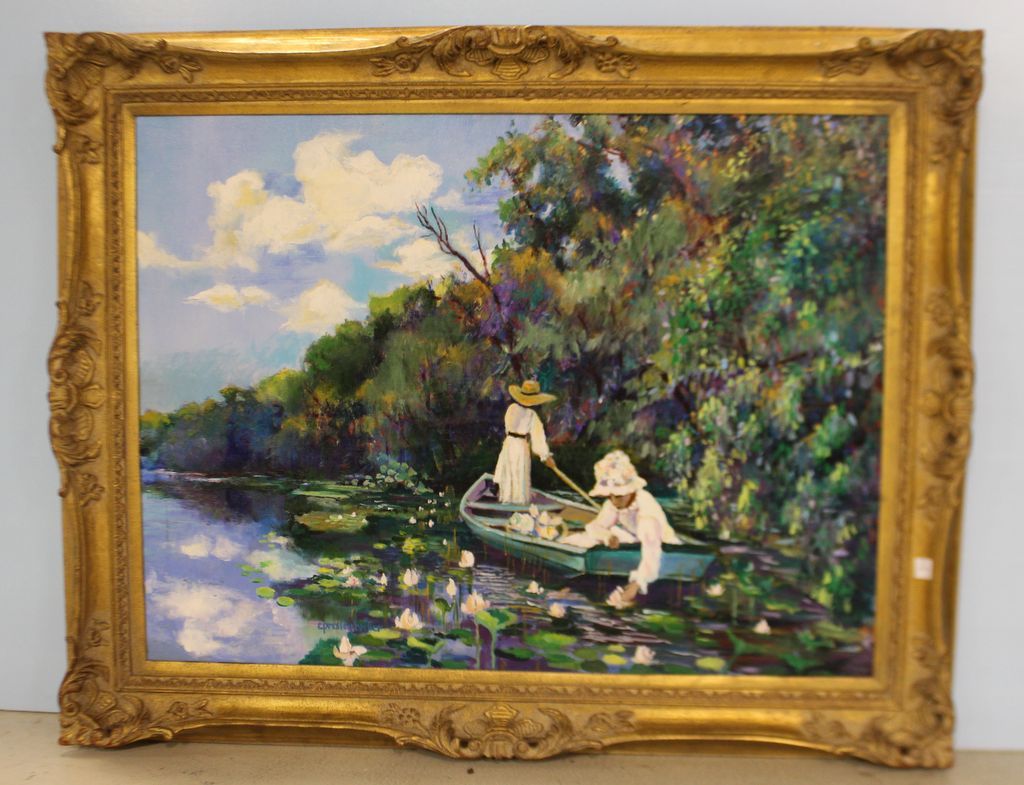 Large oil painting of two ladies in boat on lily pond. Painting signed C. Presley Becker; 48" w., 40" h. Large oil painting of two ladies in boat on lily pond. Painting signed C. Presley Becker; 48" w., 40" h.