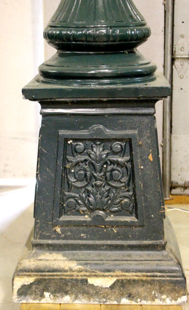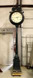 Cast aluminum park clock. The pole has been broken and repaired; 11' 4" h. Cast aluminum park clock. The pole has been broken and repaired; 11' 4" h.