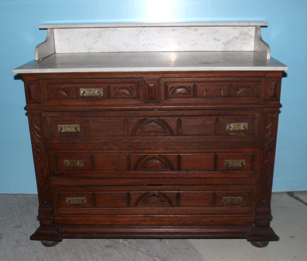 Large nineteenth century oak washstand with marble top and backsplash (crack in top of backsplash); 44" w., 20" d., 39 1/2" h. Large nineteenth century oak washstand with marble top and backsplash (crack in top of backsplash); 44" w., 20" d., 39 1/2" h.