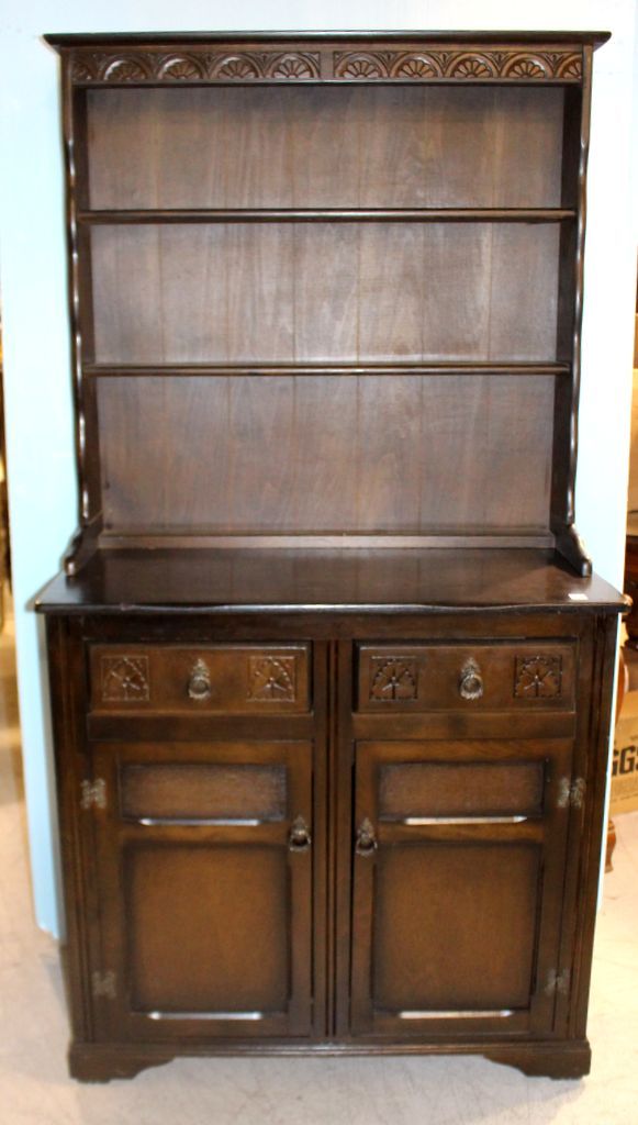 Small English Welch dresser with three shelves for plates, two drawers, two doors. 36 1/2" w., 19" d., 70 /2" h. Small English Welch dresser with three shelves for plates, two drawers, two doors. 36 1/2" w., 19" d., 70 /2" h.