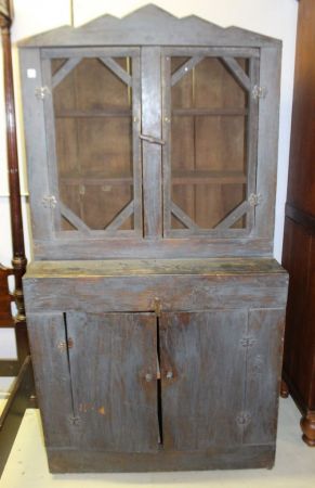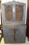 Painted step back cupboard. Cabinet has original blue paint and screen doors. 39 1/2" w., Painted step back cupboard. Cabinet has original blue paint and screen doors. 39 1/2" w.,