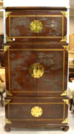 Lacquer entertainment center in the oriental design with accenting brass straps. 37 1/2" w., 23" d., 77" h. Lacquer entertainment center in the oriental design with accenting brass straps. 37 1/2" w., 23" d., 77" h.