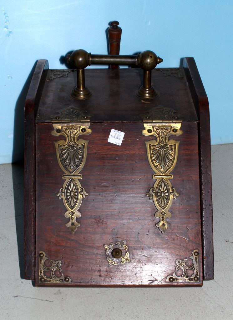 English coal hodge with brass handle and hinges; 13 1/2" w., 18" d., 12" h. English coal hodge with brass handle and hinges; 13 1/2" w., 18" d., 12" h.